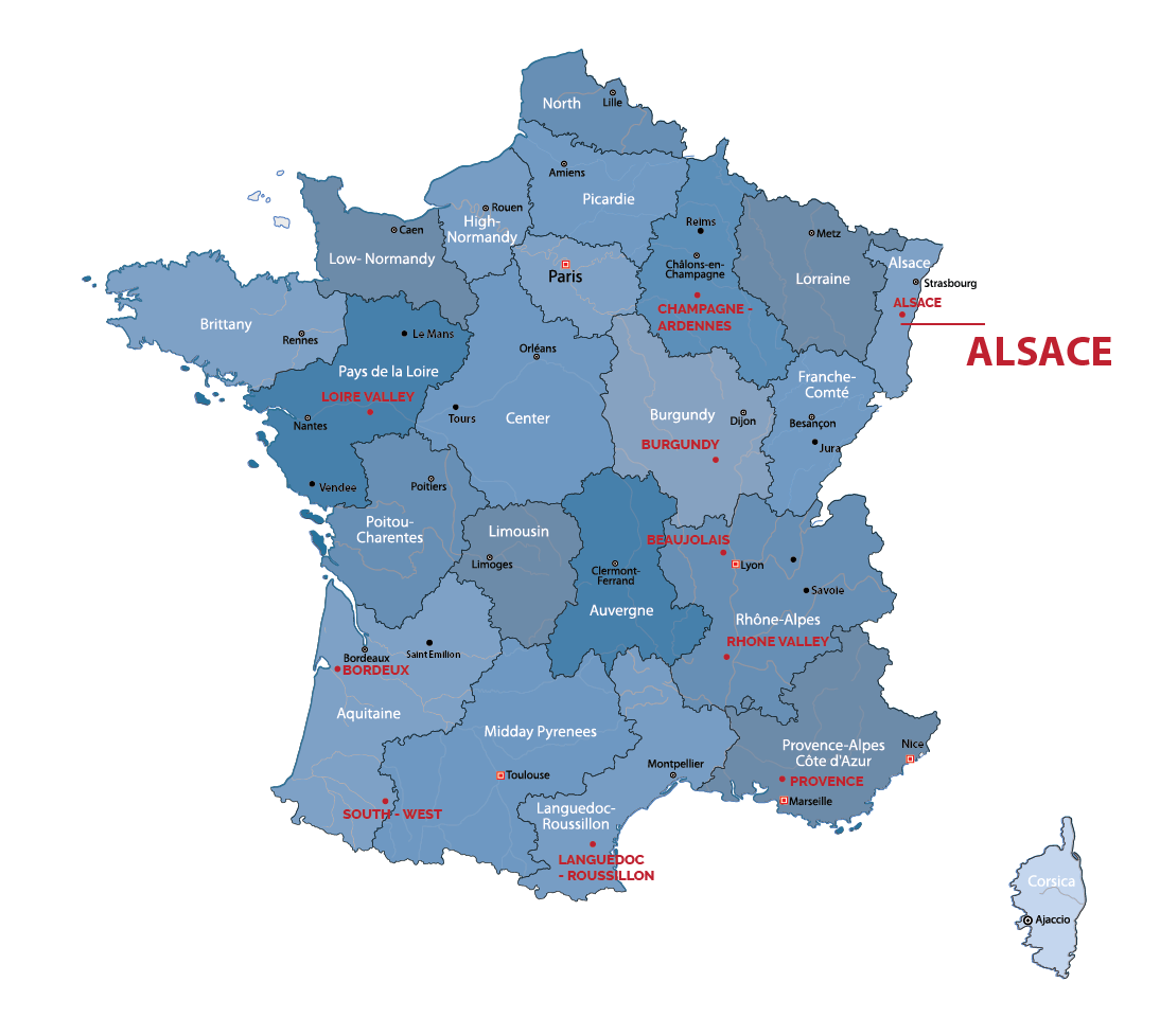 The Alsace Wine Region in France, nestled in the northeast along the Rhine River and the Vosges Mountains, is celebrated for its aromatic white wines primarily crafted from grape varieties such as Riesling, Gewürztraminer, Pinot Gris, and Pinot Blanc.